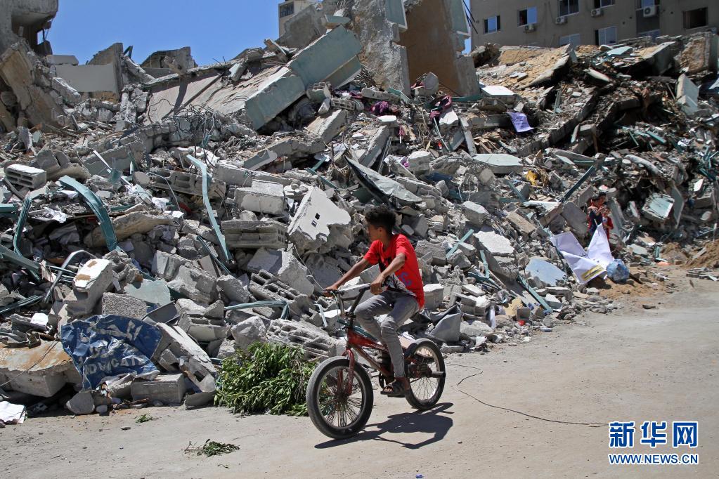 5月23日,一個男孩在加沙城騎車經(jīng)過遭以軍空襲損毀的賈拉塔。5月10日以來,以色列與加沙地帶武裝組織之間爆發(fā)嚴(yán)重沖突。20日晚,哈馬斯與以色列方面各自宣布,雙方已達(dá)成?;饏f(xié)議,?;饛?1日凌晨開始。新華社發(fā)(里澤克·阿卜杜勒·賈瓦德攝)
