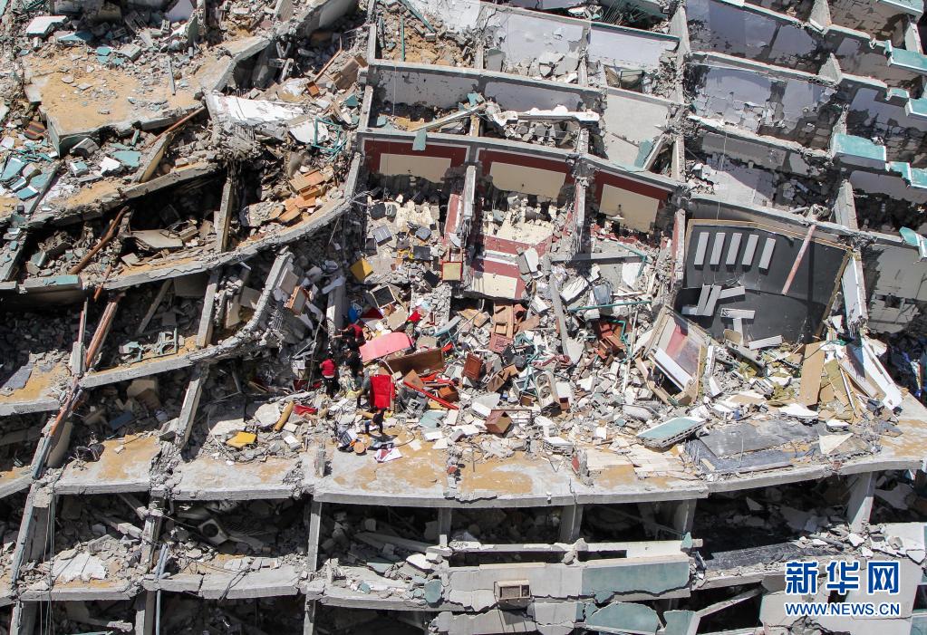 這是5月23日在加沙城拍攝的遭以軍空襲損毀的賈拉塔。5月10日以來(lái),以色列與加沙地帶武裝組織之間爆發(fā)嚴(yán)重沖突。20日晚,哈馬斯與以色列方面各自宣布,雙方已達(dá)成?;饏f(xié)議,?;饛?1日凌晨開始。新華社發(fā)(里澤克·阿卜杜勒·賈瓦德攝)