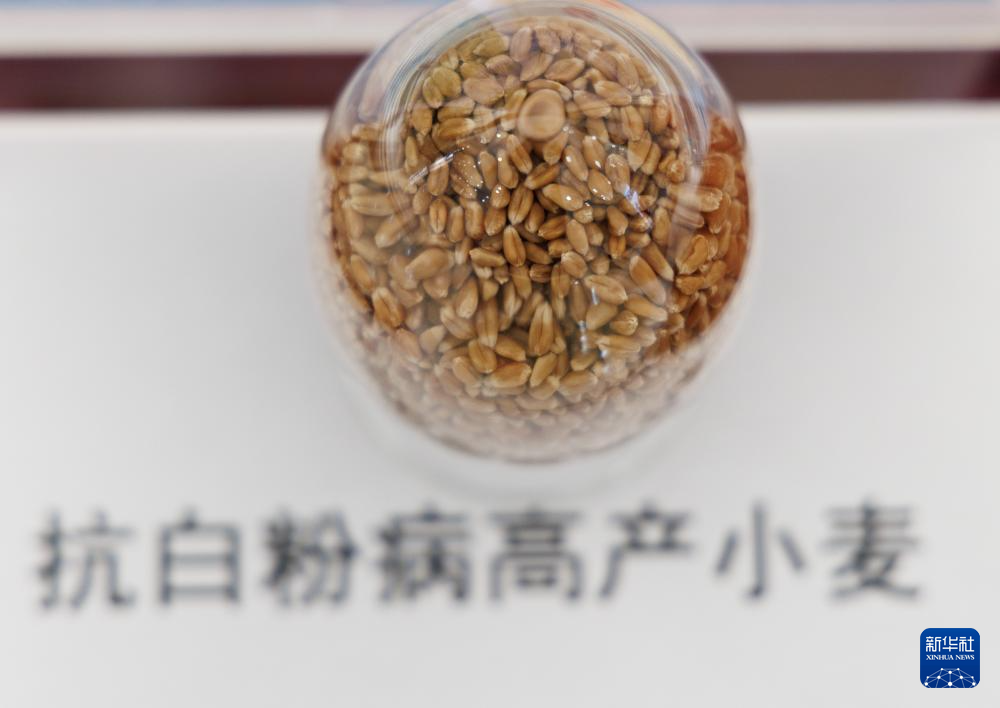 这是发布会现场展示的抗白粉病高产小麦(12月22日摄)。
