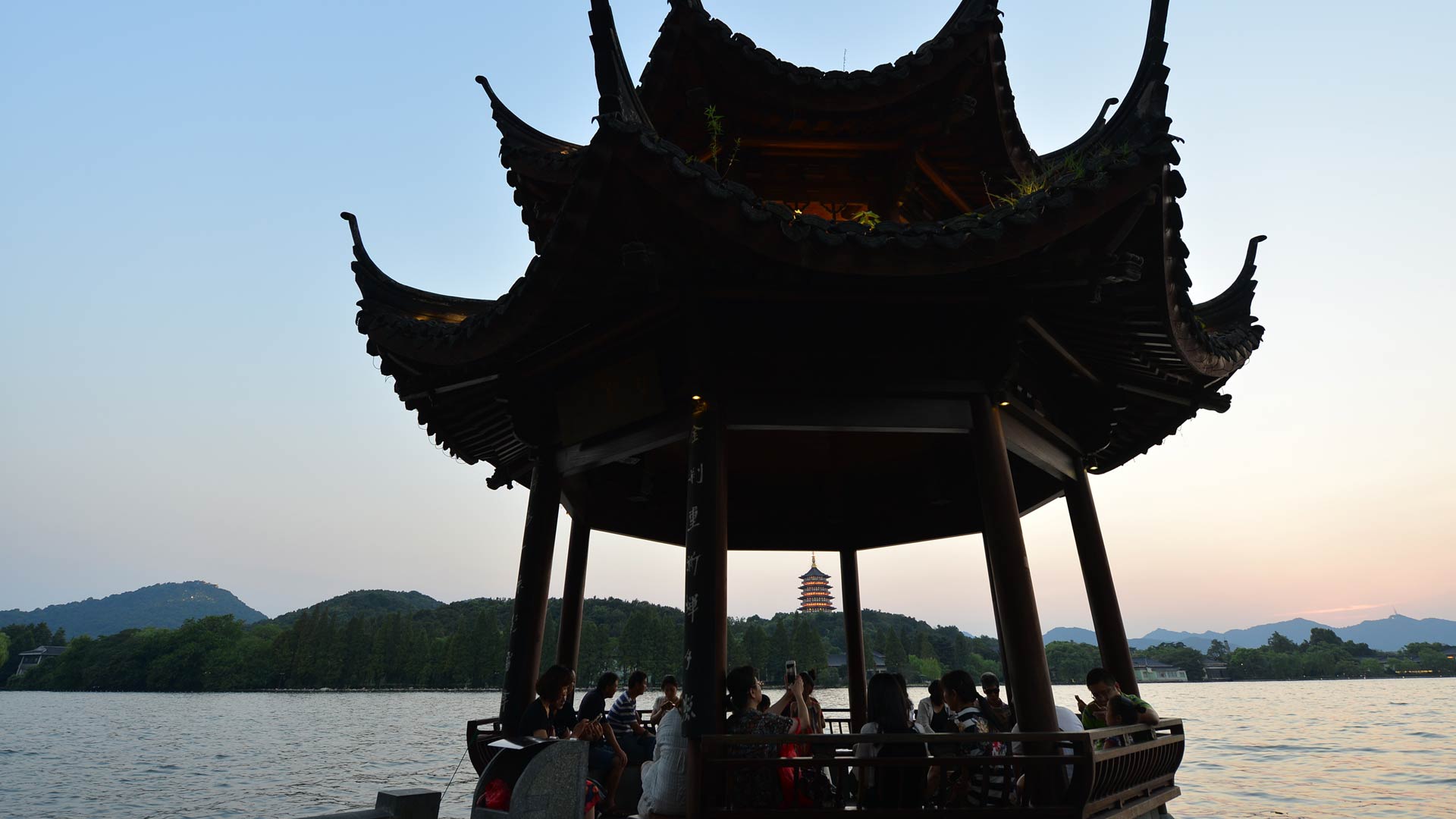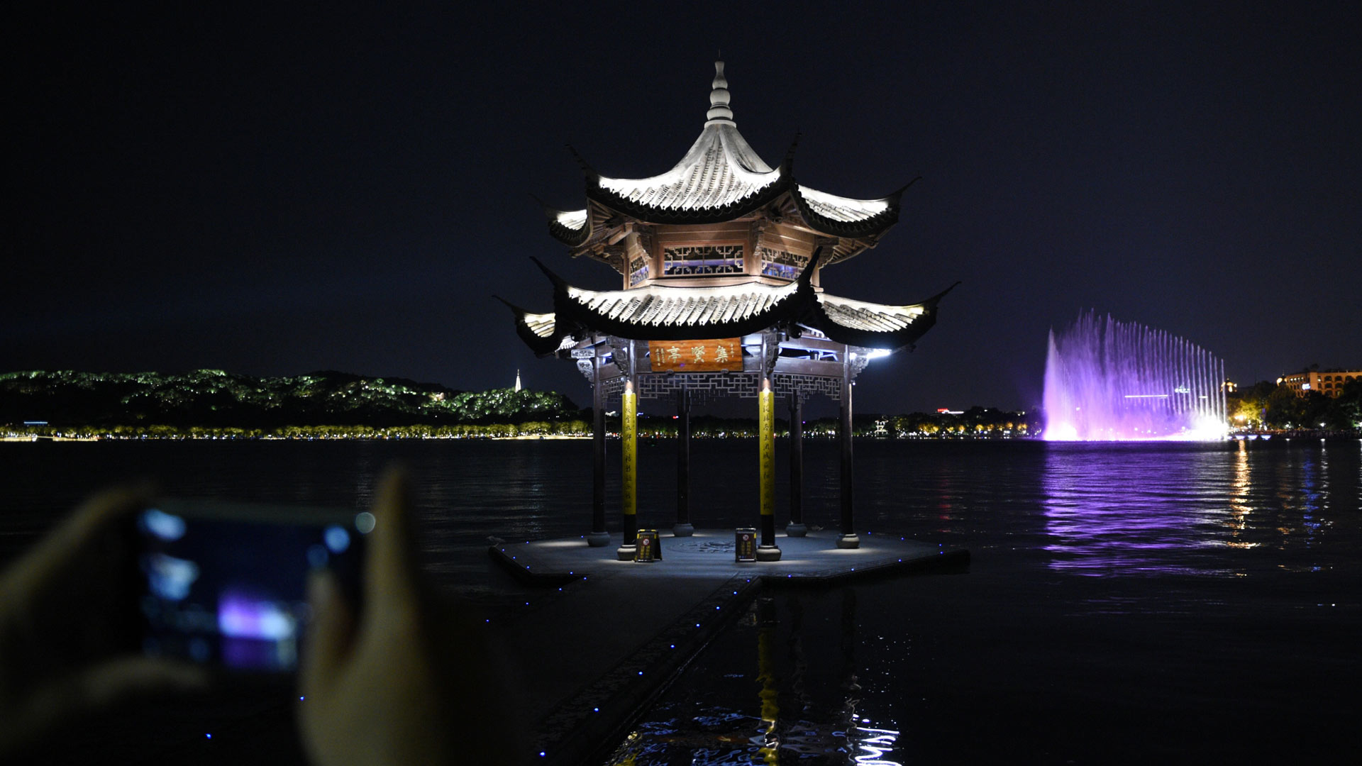 8月29日,游客在西湖集賢亭邊欣賞西湖夜色。傍晚的西湖邊,暮色與燈光交相輝映,市民和游客絡繹不絕。新華社記者 鞠煥宗 攝