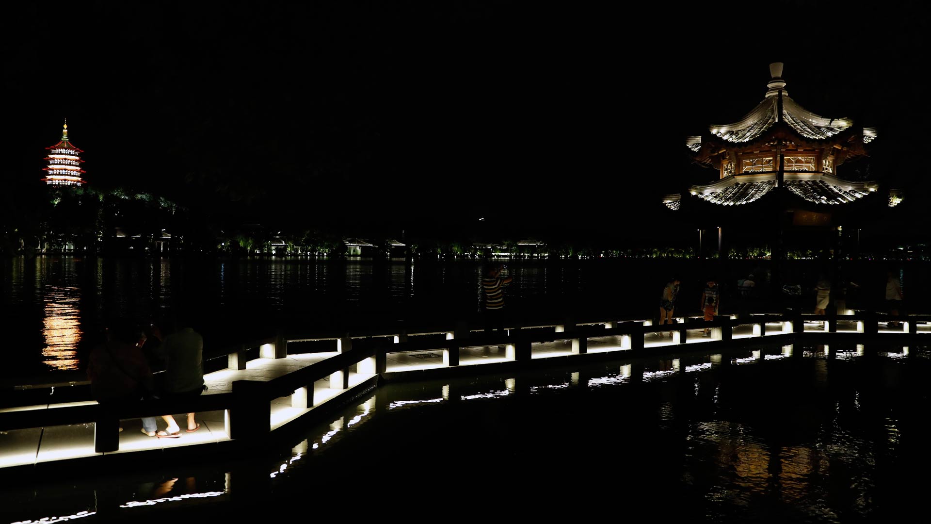 8月26日,行人在杭州西湖白堤上拍攝保俶塔夜景。新華社記者張鋮攝
