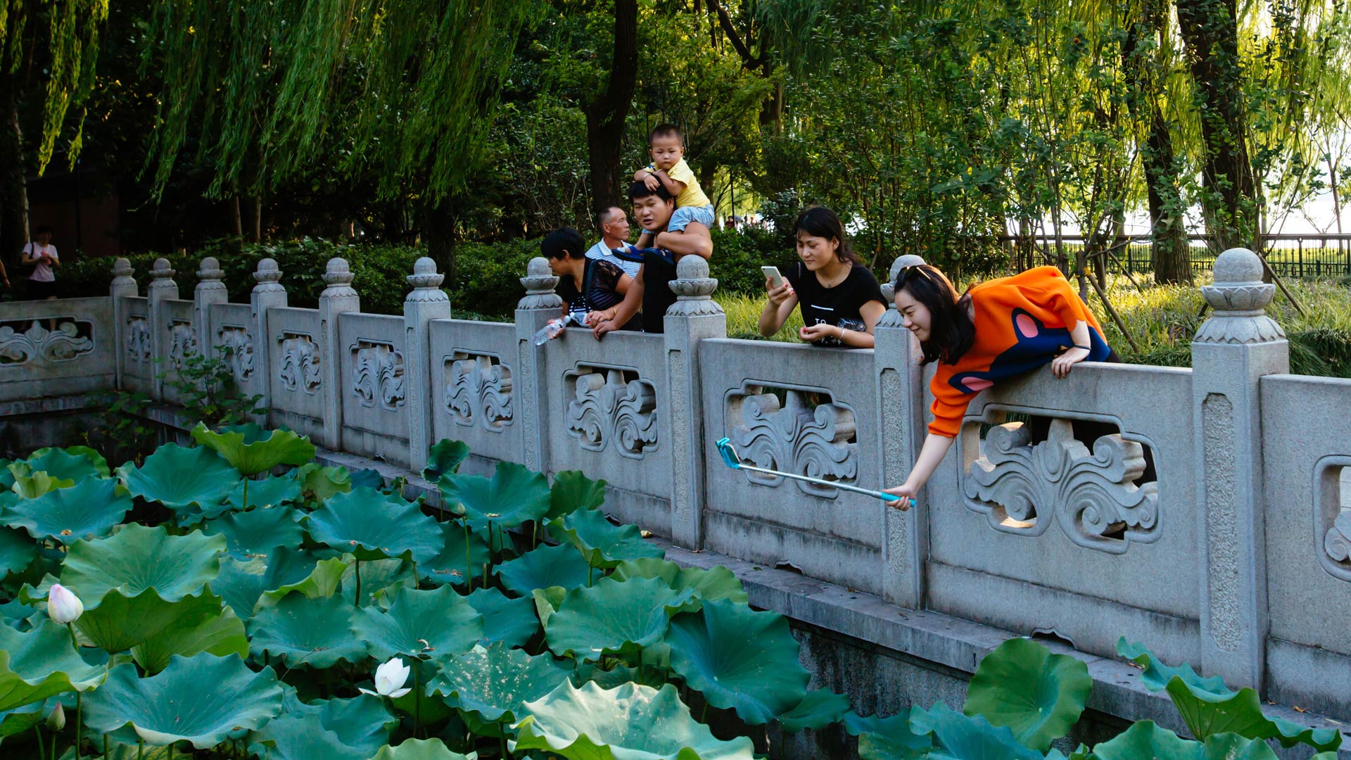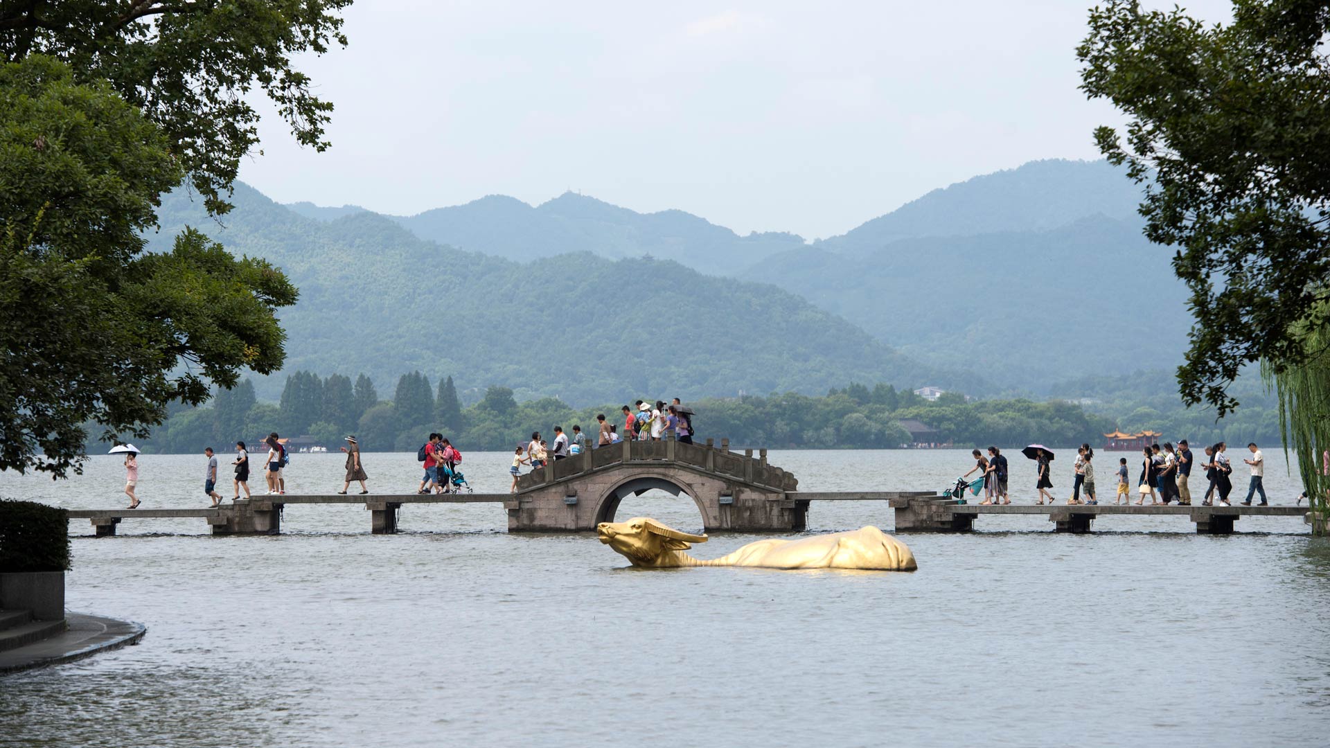 8月27日,游客在西湖邊涌金橋欣賞西湖風景。 新華社記者 鞠煥宗 攝