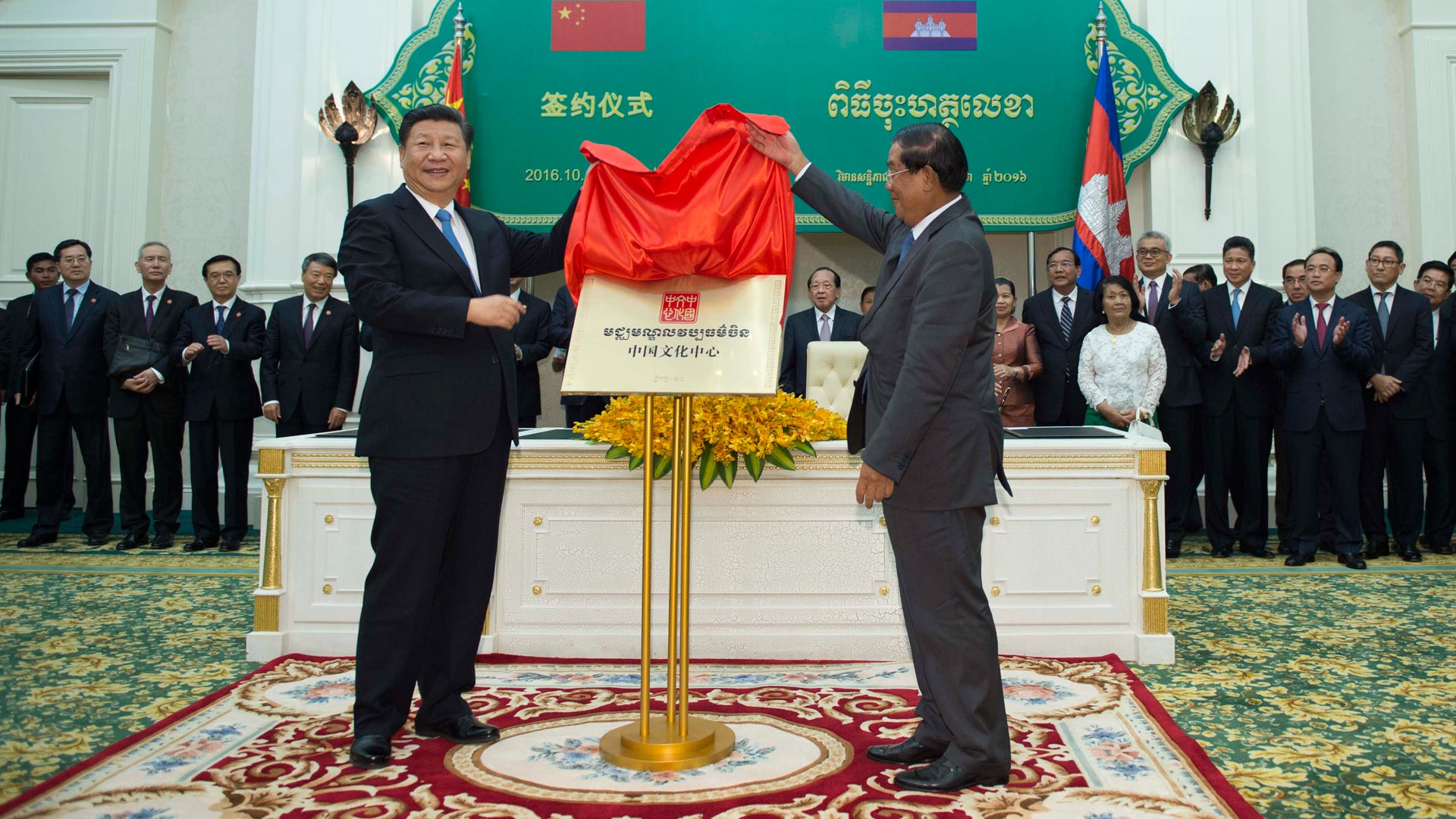 10月13日,國(guó)家主席習(xí)近平在金邊同柬埔寨首相洪森舉行會(huì)談。會(huì)談后,兩國(guó)領(lǐng)導(dǎo)人共同出席金邊中國(guó)文化中心揭牌儀式。 新華社記者 謝環(huán)馳 攝
