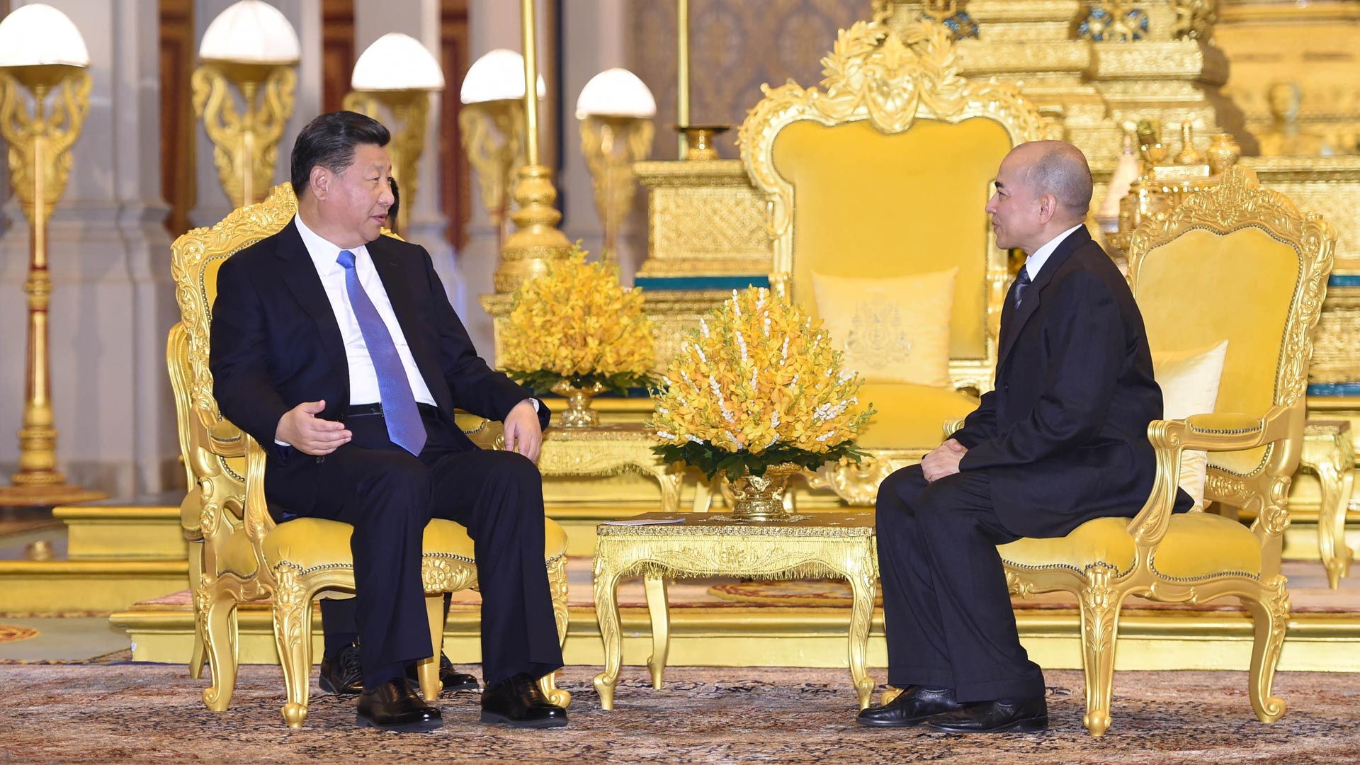 10月13日,國(guó)家主席習(xí)近平在金邊會(huì)見(jiàn)柬埔寨國(guó)王西哈莫尼。新華社記者 謝環(huán)馳 攝