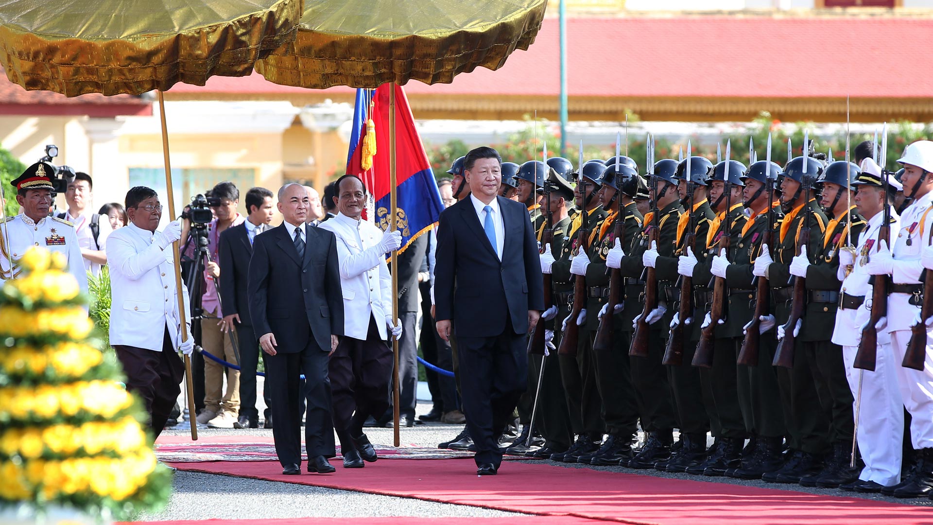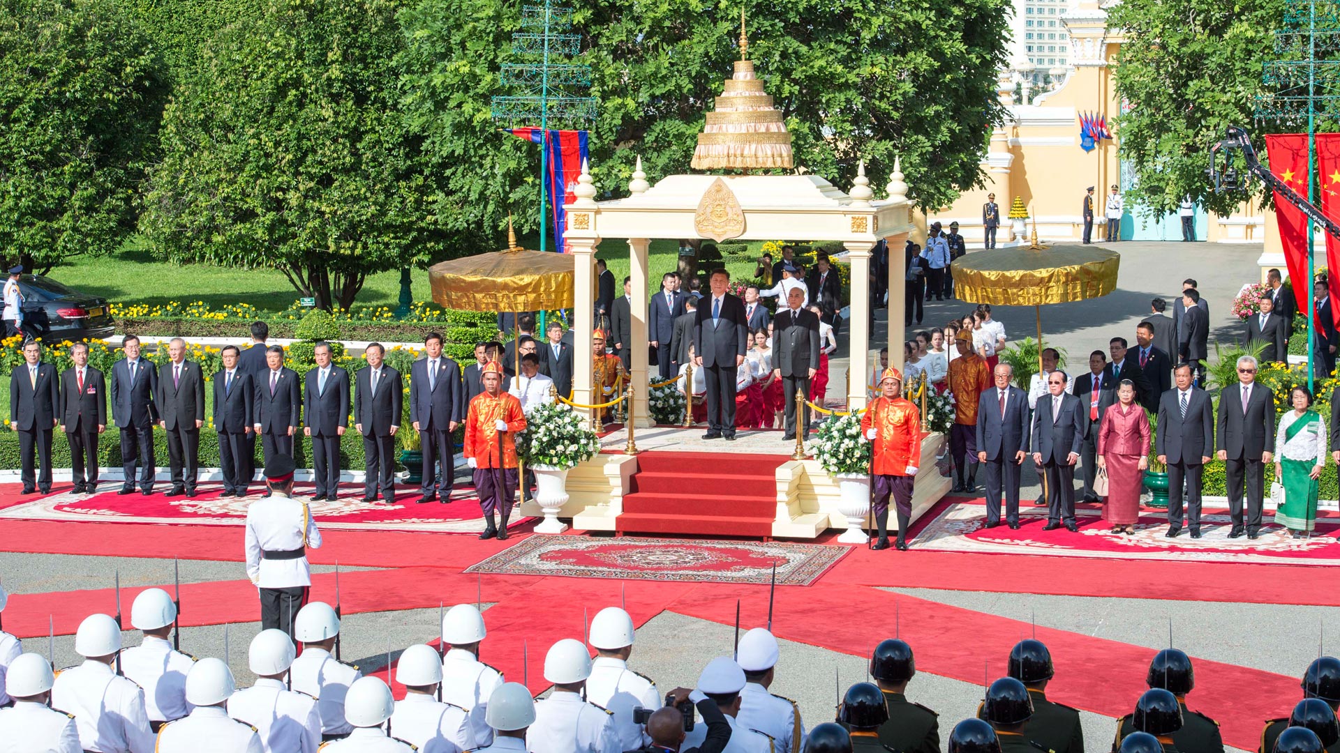 10月13日,國(guó)家主席習(xí)近平在金邊會(huì)見(jiàn)柬埔寨國(guó)王西哈莫尼。會(huì)見(jiàn)前,習(xí)近平出席西哈莫尼在王宮舉行的盛大歡迎儀式。 新華社記者 姚大偉 攝