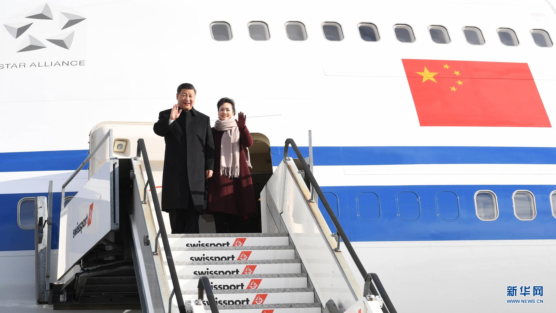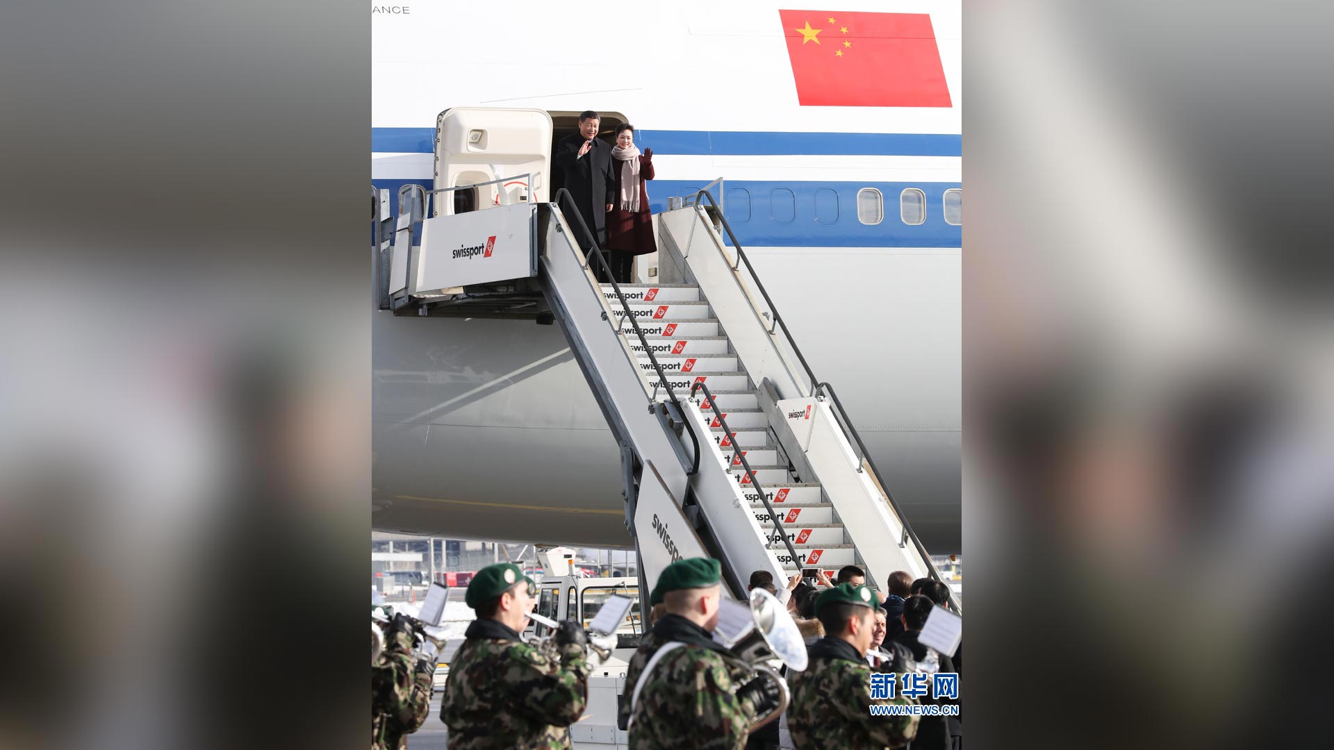1月15日,國(guó)家主席習(xí)近平乘專機(jī)抵達(dá)蘇黎世,開始對(duì)瑞士聯(lián)邦進(jìn)行國(guó)事訪問。 這是習(xí)近平和夫人彭麗媛步出艙門。新華社記者饒愛民攝2017-01-16