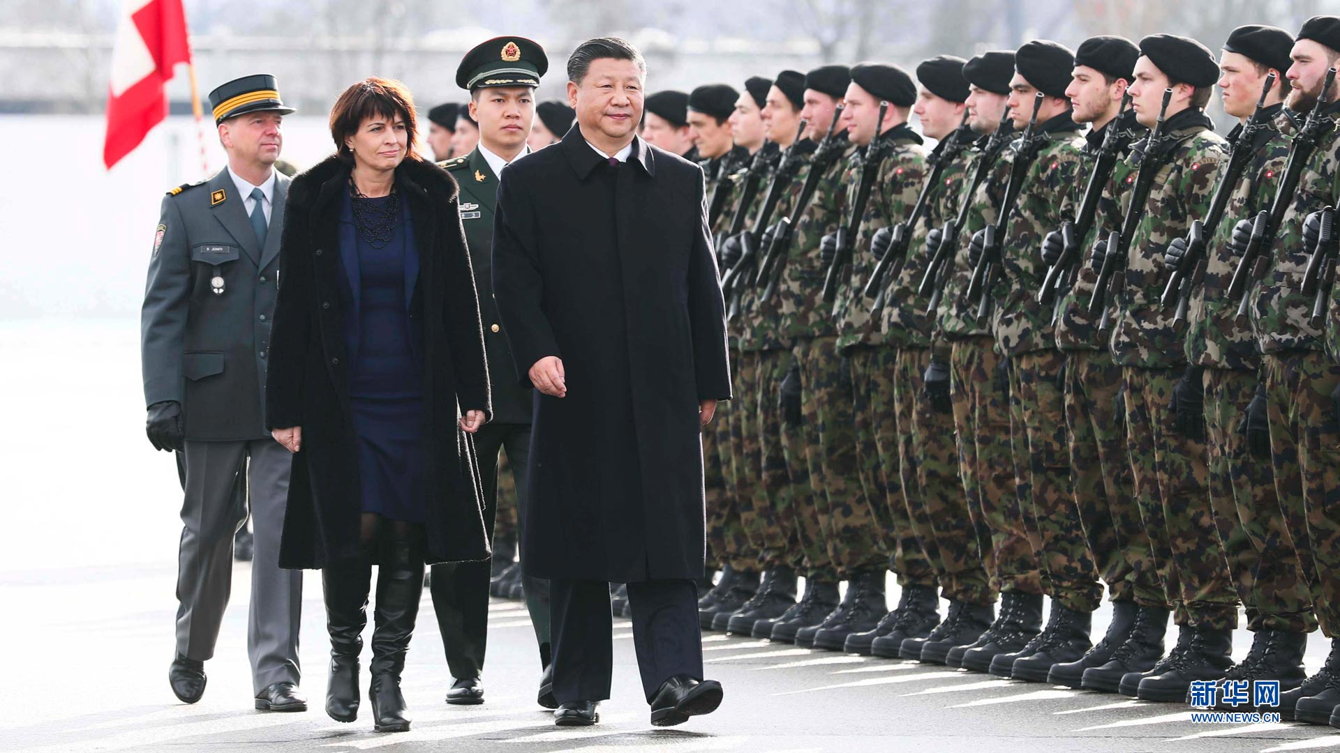 1月15日,國(guó)家主席習(xí)近平乘專機(jī)抵達(dá)蘇黎世,開始對(duì)瑞士聯(lián)邦進(jìn)行國(guó)事訪問。這是習(xí)近平在瑞士聯(lián)邦主席洛伊特哈德陪同下檢閱儀仗隊(duì)。新華社記者蘭紅光攝2017-01-16