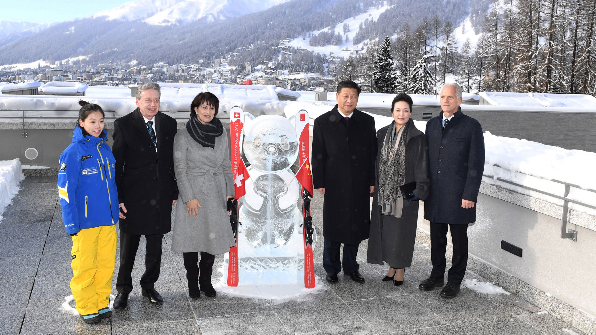 1月17日,國(guó)家主席習(xí)近平同瑞士聯(lián)邦主席洛伊特哈德在達(dá)沃斯共同啟動(dòng)中瑞旅游年。兩國(guó)元首夫婦等在熊貓冰雕像和印有中瑞兩國(guó)國(guó)旗及“中瑞旅游年”字樣的滑雪板旁合影留念。新華社記者 饒愛民 攝2017-01-18