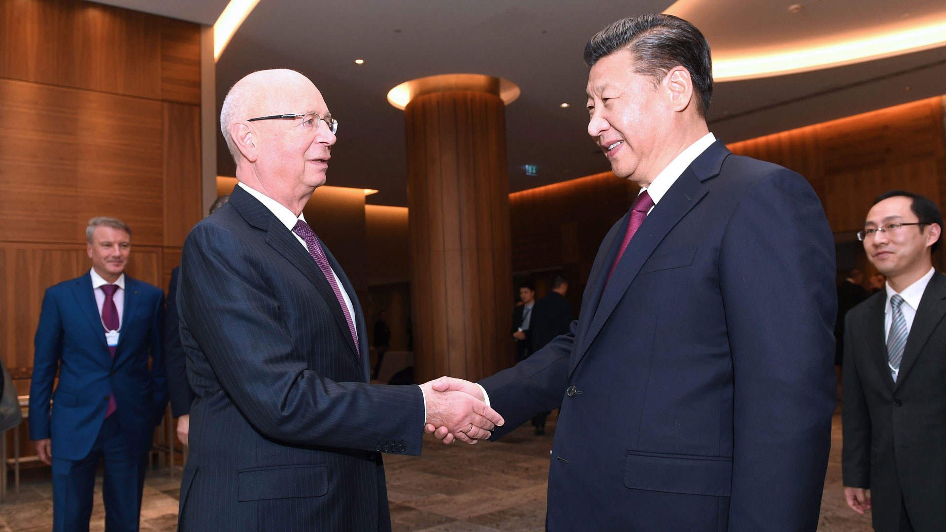 1月17日,國(guó)家主席習(xí)近平在瑞士達(dá)沃斯國(guó)際會(huì)議中心出席世界經(jīng)濟(jì)論壇2017年年會(huì)開幕式,并發(fā)表題為《共擔(dān)時(shí)代責(zé)任共促全球發(fā)展》的主旨演講。這是習(xí)近平同世界經(jīng)濟(jì)論壇創(chuàng)始人兼執(zhí)行主席施瓦布在一起。 新華社記者 蘭紅光 攝2017-01-18