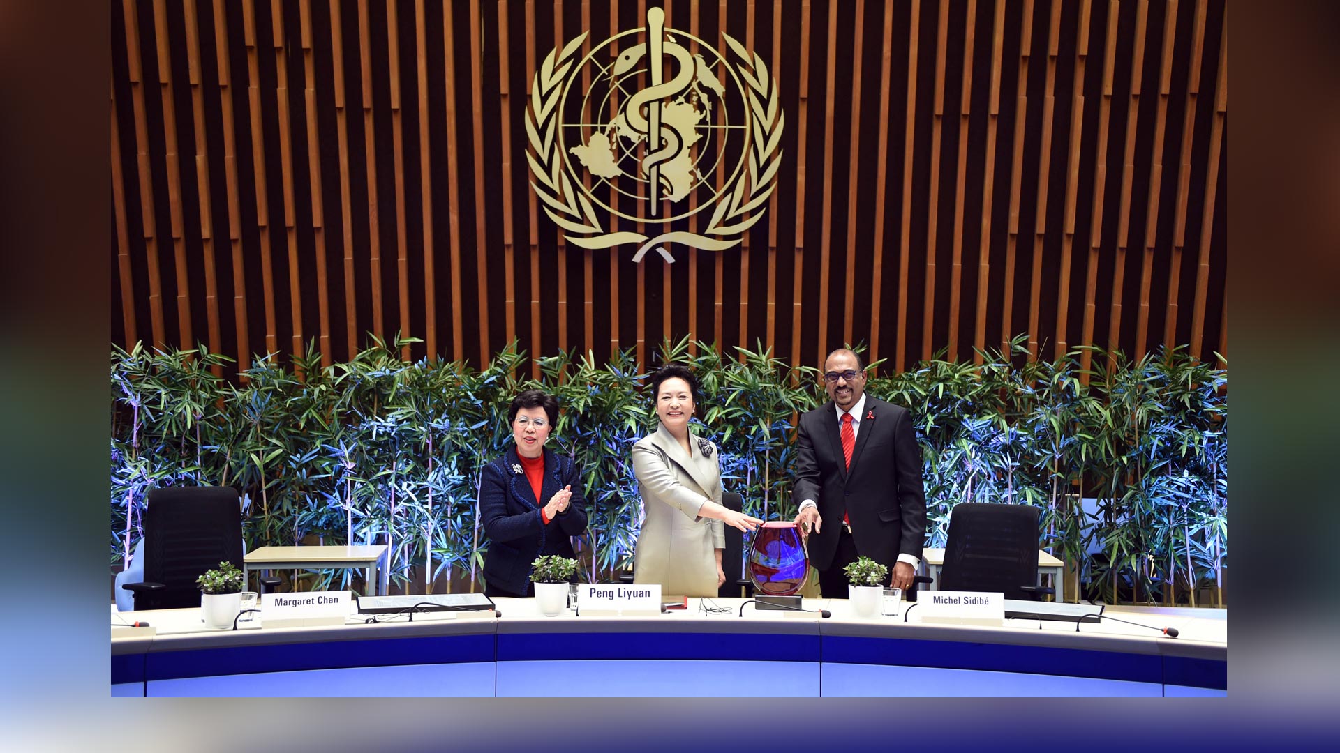 1月18日,國(guó)家主席習(xí)近平夫人、世界衛(wèi)生組織結(jié)核病和艾滋病防治親善大使彭麗媛應(yīng)世界衛(wèi)生組織總干事陳馮富珍和聯(lián)合國(guó)艾滋病規(guī)劃署執(zhí)行主任西迪貝邀請(qǐng),在瑞士日內(nèi)瓦出席為她舉行的親善大使任期續(xù)延暨頒獎(jiǎng)儀式。這是世界衛(wèi)生組織總干事陳馮富珍向彭麗媛頒發(fā)世衛(wèi)組織榮譽(yù)勛章。新華社記者謝環(huán)馳攝2017-01-19