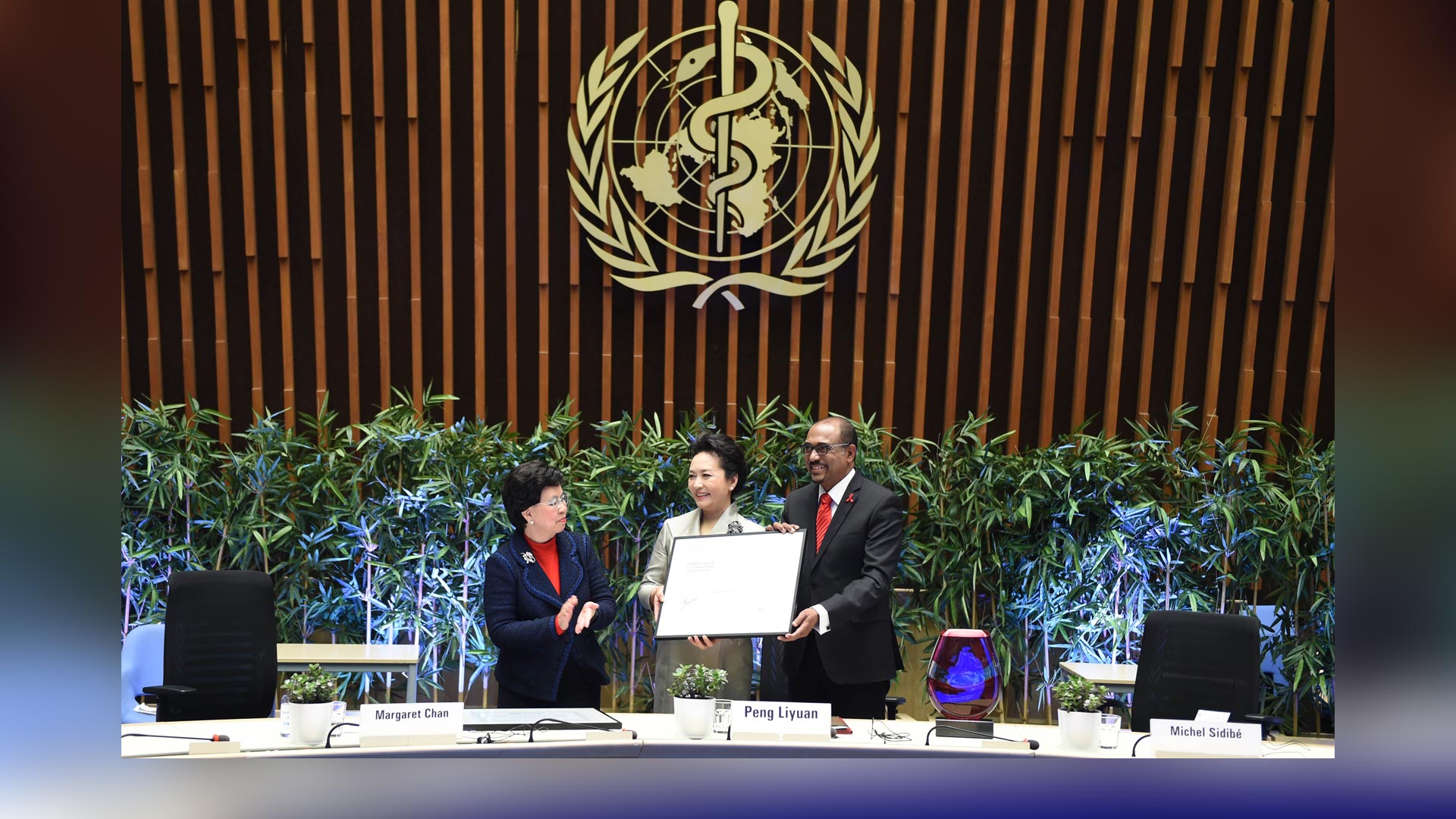 1月18日,國(guó)家主席習(xí)近平夫人、世界衛(wèi)生組織結(jié)核病和艾滋病防治親善大使彭麗媛應(yīng)世界衛(wèi)生組織總干事陳馮富珍和聯(lián)合國(guó)艾滋病規(guī)劃署執(zhí)行主任西迪貝邀請(qǐng),在瑞士日內(nèi)瓦出席為她舉行的親善大使任期續(xù)延暨頒獎(jiǎng)儀式。這是聯(lián)合國(guó)艾滋病規(guī)劃署執(zhí)行主任西迪貝向彭麗媛頒發(fā)艾滋病防治“杰出成就獎(jiǎng)”獲獎(jiǎng)證書。新華社記者謝環(huán)馳攝2017-01-19