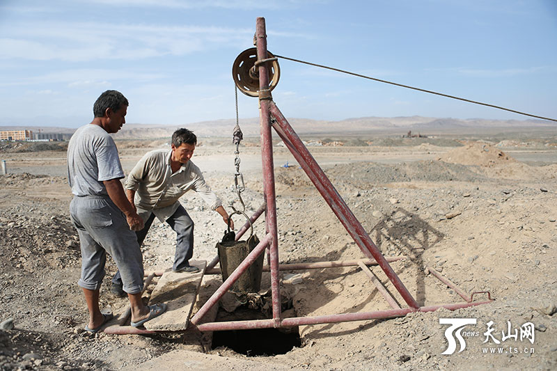 每天早上9點(diǎn),庫爾班·司馬義準(zhǔn)時(shí)到豎井旁開始工作,中午僅有一個(gè)小時(shí)的吃飯時(shí)間。在并不寬敞的豎井里一上一下,庫爾班原本白色的衣服上一片一片的黑印。天氣酷熱難耐,庫爾班·司馬義只是擦擦汗,看著喊熱的我們,眼睛笑成了一條縫兒,看到有人試圖到井邊去,他連忙提醒小心。