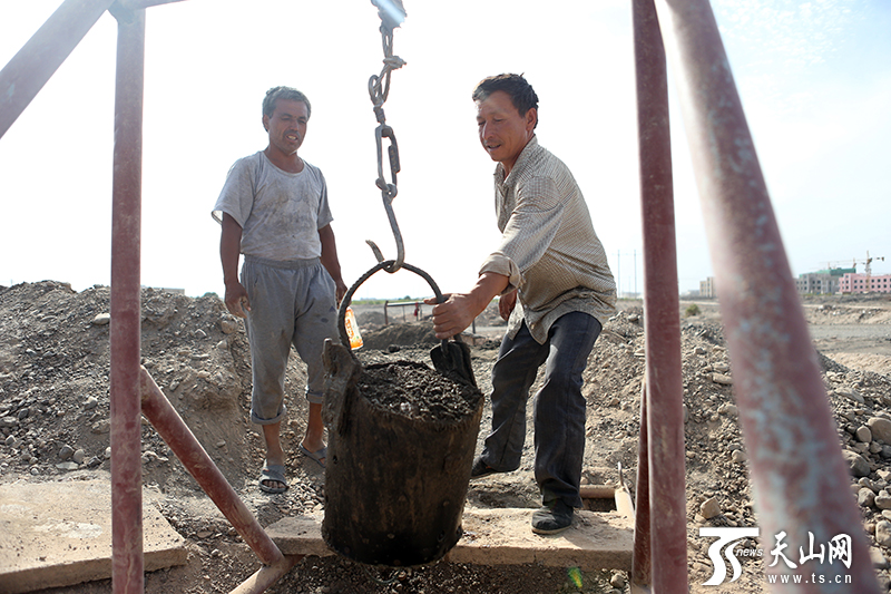 一根繩、一個(gè)桶、一輛拖拉機(jī)頭,就是庫爾班·司馬義所有的作業(yè)工具。下井時(shí),人坐在一個(gè)T形的鐵管上,用繩索固定好,一頭連著的拖拉機(jī)緩緩開動(dòng),將繩索這頭的人吊入豎井中。大約七八分鐘后,拖拉機(jī)后退,一小桶泥沙從井里升上來,庫爾班和伙計(jì)們小心地站在井口,伸手取下桶來,將泥沙倒掉又掛在繩索上,如此重復(fù)。