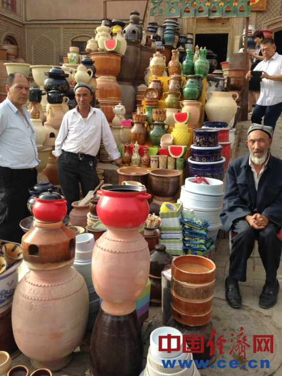 現(xiàn)年50歲的買買提?依明是一個(gè)土陶巴扎經(jīng)營者,說起這座老城的變化,他感慨萬千:“你們猜猜這個(gè)房子有多少年了”,記者們表示不知道,“300年了,我們家在這5代人哩”,買買提?依明說,原來的房子很小,巷子也很窄,家里開了個(gè)旅舍,人多的時(shí)候還要打地鋪,生意也不好。后來房屋改造,在自家原址上蓋了新房,全家人高興得不得了,自己花了15萬裝修,整修一新的房屋讓旅舍又紅紅火火的開了起來,大兒子大學(xué)畢業(yè)后已經(jīng)回來幫忙,小兒子還在重慶讀大學(xué)。依明說,當(dāng)初改造的時(shí)候政府讓我們選擇,可以搬出去住樓房,也可以留在這,街坊鄰居們很少有搬走的,現(xiàn)在我周圍還是那些老朋友。說起自己覺得裝修貴不貴,依明說:“政府花了那么多錢給我們蓋房子,我們自己花一點(diǎn)也是應(yīng)該的,感謝政府給我們這么好的生活。”