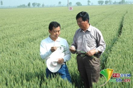 2010年5月,王輝(右)與團(tuán)隊(duì)助手在查看小麥發(fā)苗情況。王輝供圖