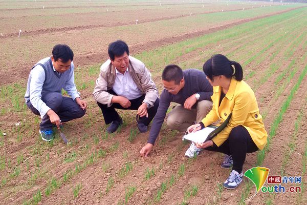2015年11月,王輝(左二)與團(tuán)隊(duì)人員考察小麥出苗情況。王輝供圖