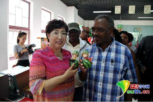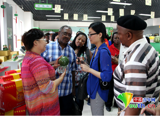 馮樂(lè)平(左一)介紹西瓜工藝品。本人供圖