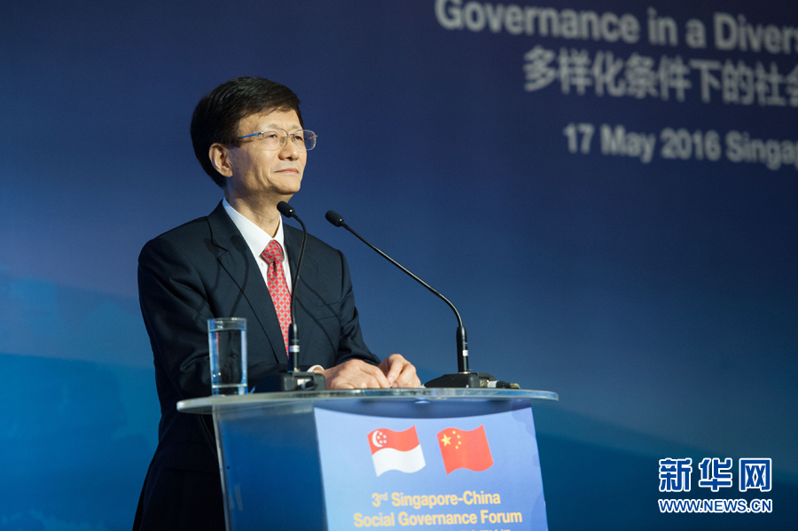 5月17日,中共中央政治局委員、中央政法委書記、中央綜治委主任孟建柱出席在新加坡舉行的第三屆中新社會治理高層論壇。新華社發(fā)(王應(yīng)耀攝)