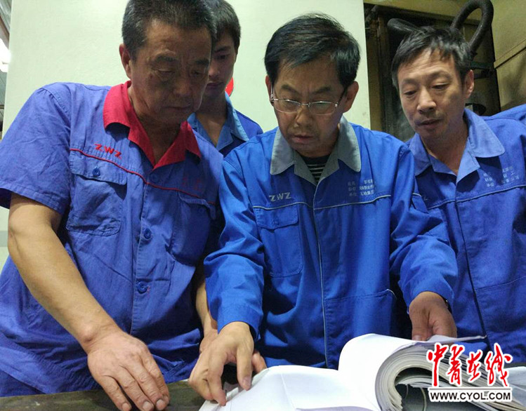 李書乾(左一)正帶領徒弟于慶壯(左二)在車間與眾人進行研討