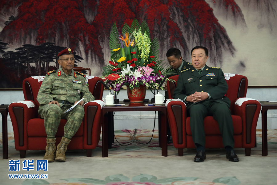 12月5日,中央軍委副主席范長龍?jiān)诒本┌艘淮髽菚妬碓L的吉布提軍隊(duì)總參謀長扎卡里亞。 新華社記者 琚振華 攝