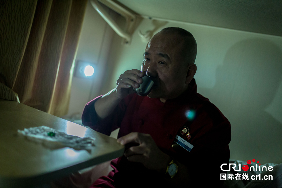 晚上11點多,大部分旅客已進入夢鄉(xiāng),白振慶師傅終于可以回到休息室稍作調(diào)整,但只能小睡幾個小時,凌晨4點白師傅還要起來為旅客準備早飯。白師傅血壓偏高,每天晚上都要吃藥進行控制。