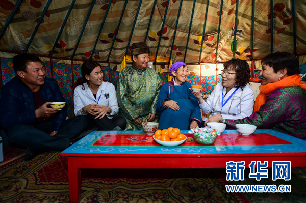 家庭責(zé)任醫(yī)務(wù)人員與阿巴嘎旗牧民道力格爾瑪一家拉家常(2月20日攝)。為緩解牧民看病難問題,從2013年起,阿巴嘎旗給超出衛(wèi)生院服務(wù)半徑10公里的每戶牧民配備小藥箱,安排家庭責(zé)任醫(yī)生,還購買了12臺內(nèi)置B超機(jī)、心電圖機(jī)、尿液分析儀等醫(yī)療設(shè)備的流動(dòng)服務(wù)車。新華社記者 連振 攝