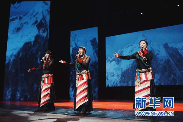 藝術(shù)團(tuán)演員為現(xiàn)場貴賓敬獻(xiàn)哈達(dá)。