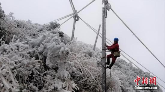 資料圖:1月29日,廣西護(hù)鳥(niǎo)坳,滾貝鄉(xiāng)供電所職工登上被凝凍的電桿檢修線路。石峰 攝