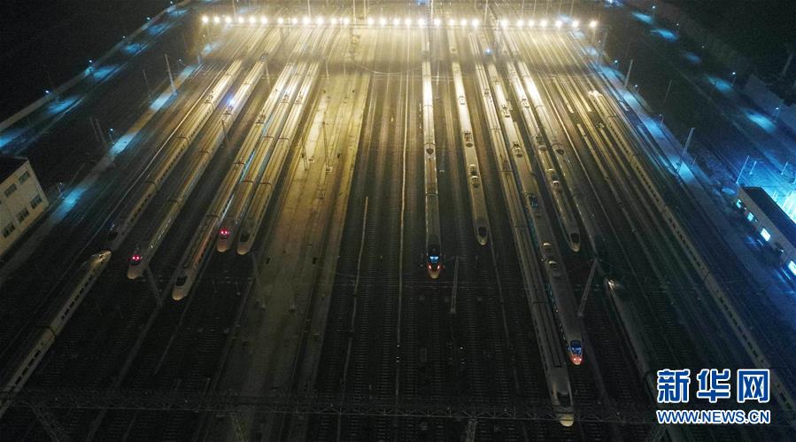 這是1月31日清晨在貴陽北動車運(yùn)用所拍攝的動車組列車。春運(yùn)即將開始,貴陽北動車運(yùn)用所各個系統(tǒng)的工作人員對動車組列車進(jìn)行全面細(xì)致的“體檢”,確保春運(yùn)期間動車組列車安全運(yùn)行。新華社發(fā) 吳吉斌 攝