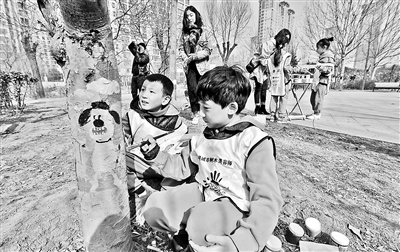 在植樹節(jié)即將到來之際,史家小學(xué)五年級4班和二年級17班的二十余名同學(xué)來到朝陽區(qū)泛海國際社區(qū)的中心花園,為這里的一棵棵小樹“穿上花衣”。
