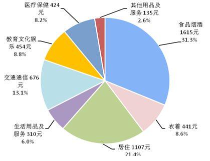 一季度,全國居民人均食品煙酒消費支出1615元,增長5.2%,占人均消費支出的比重為31.3%;人均衣著消費支出441元,增長9.4%,占人均消費支出的比重為8.6%;人均居住消費支出1107元,增長13.1%,占人均消費支出的比重為21.4%;人均生活用品及服務(wù)消費支出310元,增長11.9%,占人均消費支出的比重為6.0%;人均交通通信消費支出676元,增長4.9%,占人均消費支出的比重為13.1%;人均教育文化娛樂消費支出454元,下降5.4%,占人均消費支出的比重為8.8%;人均醫(yī)療保健消費支出424元,增長20.7%,占人均消費支出的比重為8.2%;人均其他用品及服務(wù)消費支出135元,增長6.3%,占人均消費支出的比重為2.6%。