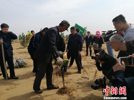 圖為在庫布其沙漠上舉行的“大型義務植樹活動”現(xiàn)場。李愛平 攝