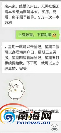 4月22日晚,海南省政府召開(kāi)《中共海南省委辦公廳海南省人民政府辦公廳關(guān)于進(jìn)一步穩(wěn)定房地產(chǎn)市場(chǎng)的通知》新聞發(fā)布會(huì),公布全省實(shí)施全域限購(gòu)。隨即,朋友圈流傳“星期一登記結(jié)婚、星期二辦理海南戶口、星期三買(mǎi)房、星期四登記(結(jié)婚)、星期五打(假結(jié)婚)手續(xù)費(fèi)、下周一離婚”等傳言和段子。南海網(wǎng)記者從海南省公安廳、??谑忻裾值炔块T(mén)了解到,此類登記結(jié)婚就可立即辦理落戶海南等傳言均不可能實(shí)現(xiàn)。