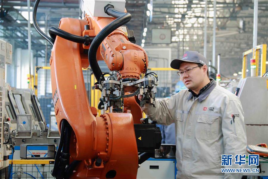 中國(guó)中車(chē)戚墅堰機(jī)車(chē)車(chē)輛工藝研究所有限公司首席技師劉云清在改進(jìn)中車(chē)戚墅堰所首條機(jī)器人渦輪殼生產(chǎn)線的機(jī)器人夾具(資料照片)。新華社發(fā)