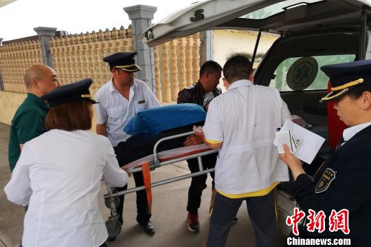 患病旅客被轉(zhuǎn)移至救護(hù)車 雷祖勝 攝