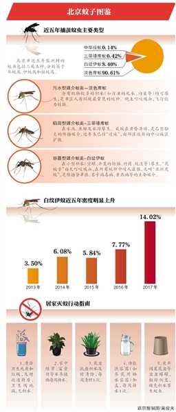 根據(jù)北京市疾控中心監(jiān)測,近年來登革熱的主要傳播媒介“花蚊子”在本市蚊種構(gòu)成比例顯著升高,從2013年3.50%上升至2017年14.02%。2018-05-10 07:28:50