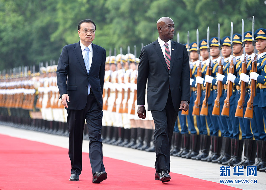 5月14日,國務(wù)院總理李克強在北京人民大會堂同來華進行正式訪問的特立尼達和多巴哥總理羅利舉行會談。會談前,李克強在人民大會堂東門外廣場為羅利舉行歡迎儀式。新華社記者 燕雁 攝
