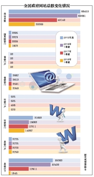 通報(bào)顯示,截至2018年3月1日,全國(guó)正在運(yùn)行的政府網(wǎng)站23269家,其中,國(guó)務(wù)院部門(mén)及其內(nèi)設(shè)、垂直管理機(jī)構(gòu)政府網(wǎng)站1872家,省級(jí)政府門(mén)戶網(wǎng)站32家,省級(jí)政府部門(mén)網(wǎng)站2349家,市級(jí)政府門(mén)戶網(wǎng)站523家,市級(jí)政府部門(mén)網(wǎng)站14097家,縣級(jí)政府門(mén)戶網(wǎng)站2750家,縣級(jí)以下政府網(wǎng)站1645家。