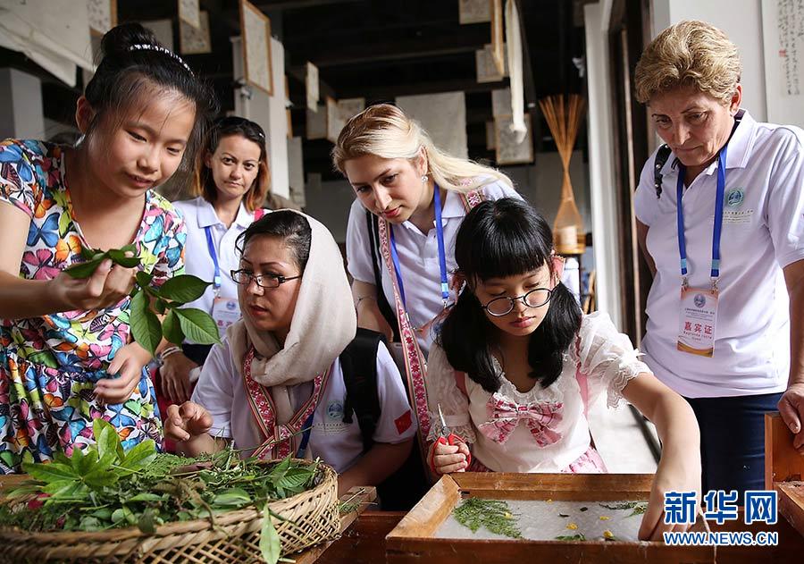 2017年8月15日,“魅力非遺——第二屆上海合作組織夏令營·非物質(zhì)文化遺產(chǎn)交流體驗(yàn)”活動在貴州省黔東南苗族侗族自治州丹寨縣萬達(dá)小鎮(zhèn)舉行。這是外國手工藝人在古法造紙體驗(yàn)館了解花草紙的制作過程。新華社發(fā)(黃曉海 攝)