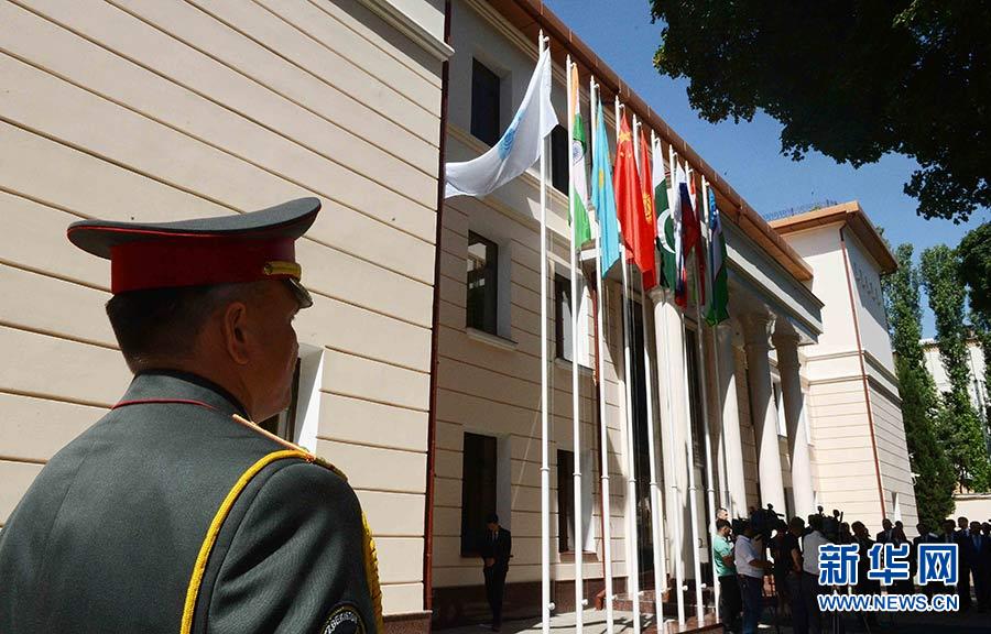 2017年6月15日,上海合作組織地區(qū)反恐怖機(jī)構(gòu)執(zhí)委會在烏茲別克斯坦首都塔什干舉行印度和巴基斯坦國旗升旗儀式,迎接兩個新成員的加入。新華社記者 沙達(dá)提 攝
