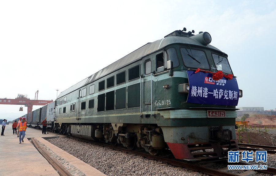 在江西省贛州市南康區(qū)贛州港,“贛州港至哈薩克斯坦”中歐班列等待發(fā)車(2017年7月27日攝)。新華社記者 彭昭之 攝