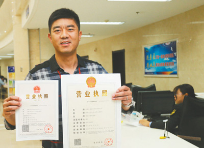 近日,山東省榮成市行政審批局正式掛牌成立,現(xiàn)場封存了相關(guān)部門29枚原審批專用章,“榮成市行政審批局”公章啟用。圖為榮成市市民領(lǐng)取一張加蓋“榮成市行政審批局”公章的營業(yè)執(zhí)照。王福東 攝