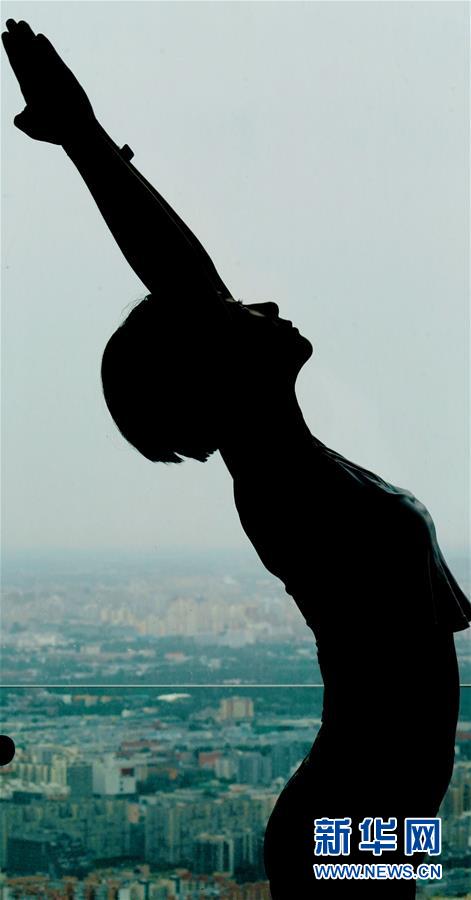 當日,數(shù)名瑜伽愛好者在專業(yè)瑜伽教練的帶領下在北京國貿大酒店70層以上的高樓層練習瑜伽,體驗高空練習瑜伽的樂趣。