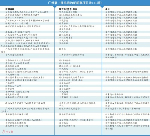據(jù)悉,廣州自去年10月起已啟動“減證便民”專項工作,由市編辦牽頭,會同市法制辦、市政務辦對市政府各部門的證明事項進行梳理審核。經(jīng)研究,市政府第一批取消7個部門共33項證明事項,其中市教育局13項、市人力資源社會保障局10項、市公安局4項、市司法局3項、市民政局1項、市交委1項、市食品藥品監(jiān)管局1項。