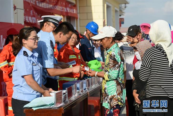 在內(nèi)蒙古鄂爾多斯市杭錦旗獨貴塔拉鎮(zhèn)芒哈圖村,獨貴塔拉鎮(zhèn)派出所民警在“民生集市”上向群眾發(fā)放新辦理的身份證(6月8日攝)。新華社記者 彭源 攝