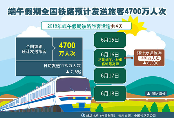 新華社北京6月13日電(記者樊曦)記者13日從中國鐵路總公司獲悉,為期4天的2018年端午假期鐵路旅客運輸將于6月15日啟動,全國鐵路預計發(fā)送旅客4700萬人次。