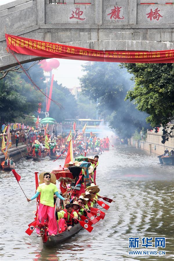 6月14日,在廣州天河區(qū)一處河道,一艘龍舟通過“迎龍橋”。當(dāng)日,廣州市天河區(qū)舉行一場熱鬧歡快的龍舟活動(dòng),來自多個(gè)村莊“走親戚”的龍舟隊(duì)參加。按廣州的傳統(tǒng)習(xí)俗,每年農(nóng)歷五月初一至初五,各村的龍舟隊(duì)要到周圍村落“走親戚”。走親戚的龍舟隊(duì)到來時(shí),受訪村子要準(zhǔn)備好龍舟飯招待來客。活動(dòng)當(dāng)天,鳴炮敲鑼,一派喜慶氣氛。新華社記者 張加揚(yáng) 攝