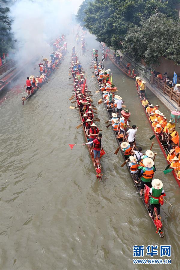 6月14日,多個(gè)村的龍舟隊(duì)在廣州市天河區(qū)一處河道劃龍舟。當(dāng)日,廣州市天河區(qū)舉行一場(chǎng)熱鬧歡快的龍舟活動(dòng),來(lái)自多個(gè)村莊“走親戚”的龍舟隊(duì)參加。按廣州的傳統(tǒng)習(xí)俗,每年農(nóng)歷五月初一至初五,各村的龍舟隊(duì)要到周圍村落“走親戚”。走親戚的龍舟隊(duì)到來(lái)時(shí),受訪村子要準(zhǔn)備好龍舟飯招待來(lái)客?;顒?dòng)當(dāng)天,鳴炮敲鑼,一派喜慶氣氛。新華社記者 張加揚(yáng) 攝