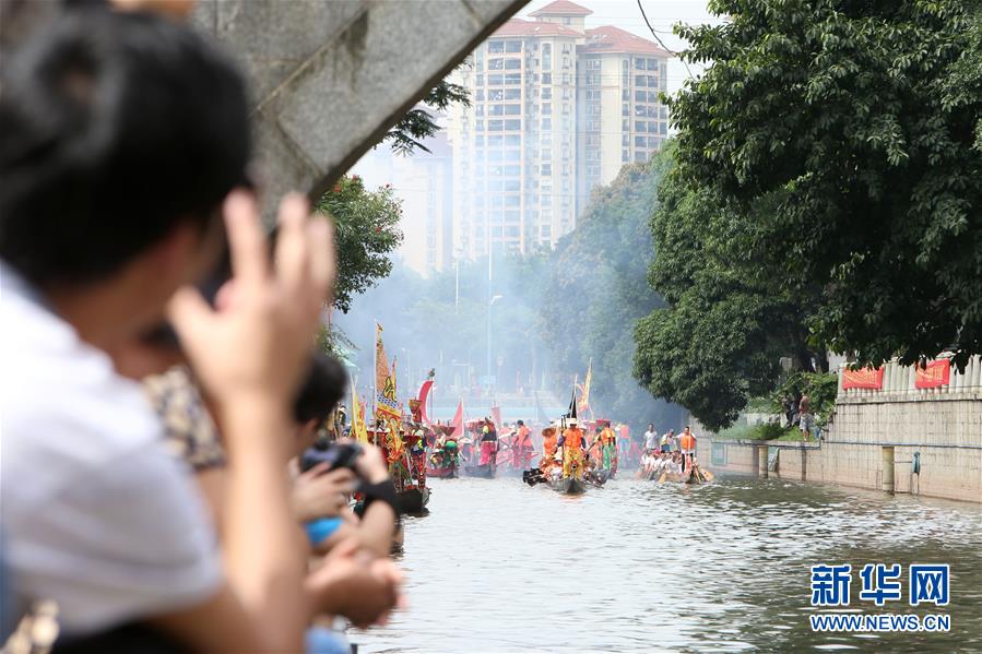 6月14日,觀眾在廣州市天河區(qū)一處河道旁等待龍舟通過。當(dāng)日,廣州市天河區(qū)舉行一場熱鬧歡快的龍舟活動,來自多個(gè)村莊“走親戚”的龍舟隊(duì)參加。按廣州的傳統(tǒng)習(xí)俗,每年農(nóng)歷五月初一至初五,各村的龍舟隊(duì)要到周圍村落“走親戚”。走親戚的龍舟隊(duì)到來時(shí),受訪村子要準(zhǔn)備好龍舟飯招待來客。活動當(dāng)天,鳴炮敲鑼,一派喜慶氣氛。新華社記者 張加揚(yáng) 攝