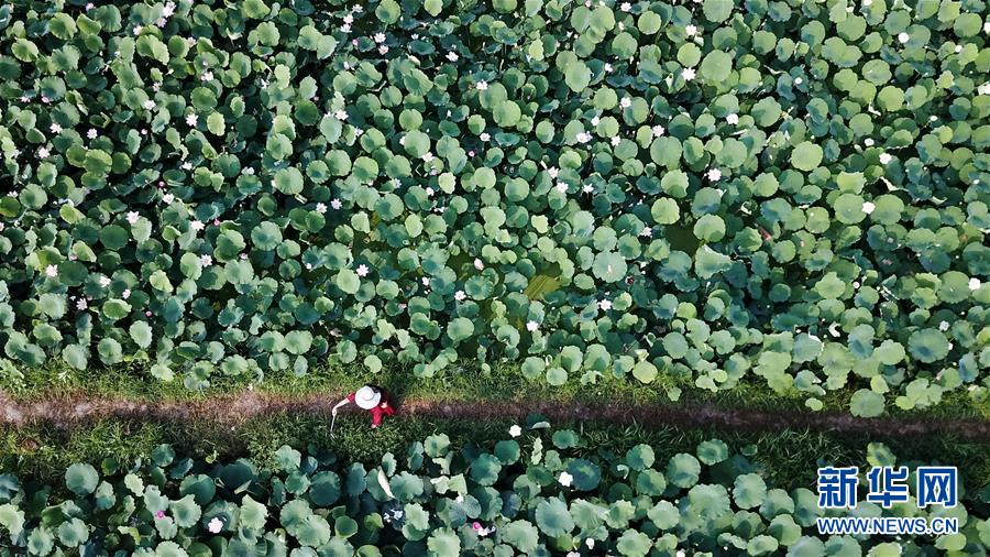 6月14日,游客在銅陵市西湖村荷花園內(nèi)賞荷(無人機拍攝)。隨著氣溫升高,安徽省銅陵市西聯(lián)鎮(zhèn)西湖村荷花園內(nèi)的300多畝荷花絢麗綻放,吸引游客前來賞荷。 新華社記者 張端 攝